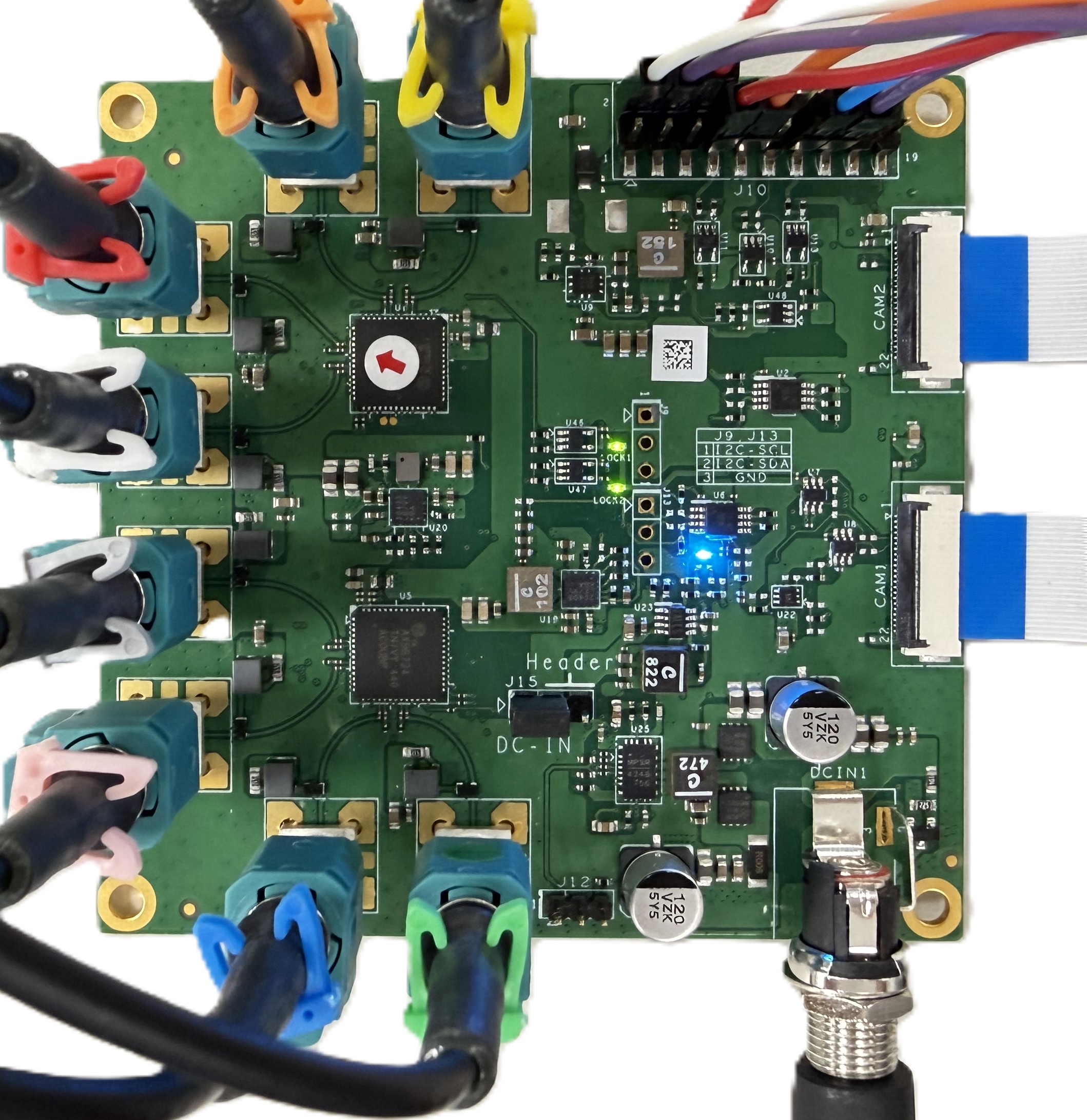 In the adaptor, PDB1/2 are the power down pins of the Deserializer, which should be high normally. INTB1/2 are the error pins of the Deserializer, which will be high when an error occurs. EXT_SYNC_IN is the deserializer's external frame sync signal pin, which can be used with the fsync-external device tree. Users can input a PWM signal to synchronize the two deserializers.